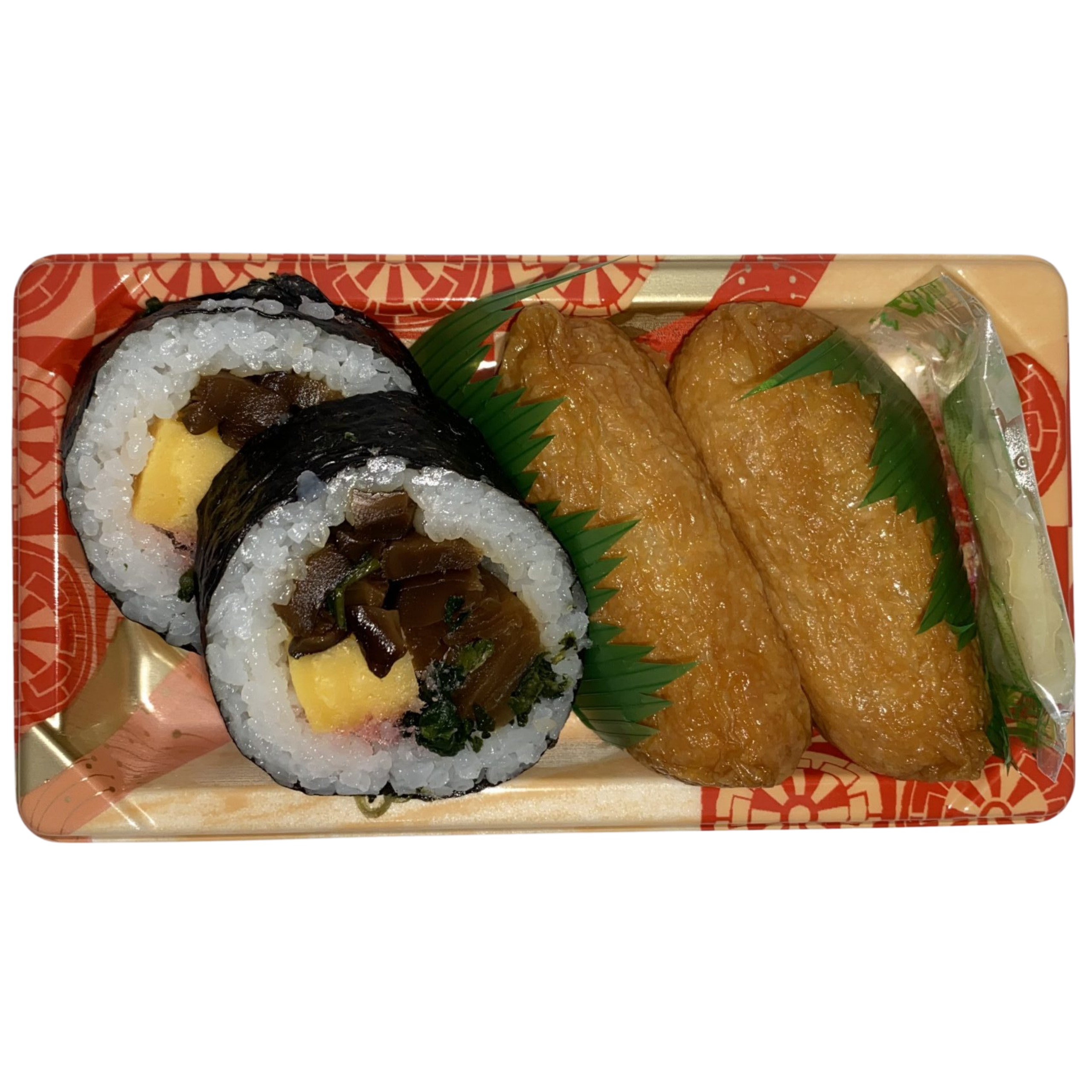 Ingredients: Sushi Rice [White Rice, Water, Sushi Seasoning (High Fructose Corn Syrup, Grain Vinegar, Water, Salt)], Inari [Tofu Pouch (Fried Bean Curd (Water, Soybean, Vegetable Oil (Corn Oil, Canola or Soybean Oil), Magnesium Chloride, Calcium Chloride), High Fructose Corn Syrup, Water, Soy Sauce (Water, Defatted Soybean, Wheat, Salt, Soybean, Alcohol), Caramel (as Coloring), Malic Acid)], Tamago [Egg, Sugar, Soybean Oil, Water, D-Sorbitol, Modified Food Starch, Starch Hydrolysate (Cassava, Sweet Potato), Vinegar, Soy Sauce (Water, Salt, Soybean, Wheat, Rice, Seed Malt), Salt, Soup Base (Corn Syrup, Dried Skipjack Tuna Extract, Dried Skipjack Tuna, Salt, Hydrolyzed Protein (Soybean, Corn, Wheat, Yeast), Dried Scads, Kelp), Sodium Metaphosphate, Monosodium L-Glutamate, Disodium Inosinate, Disodium Guanylate, Beta-Carotene (Color), Sodium Pyrophosphate], Shiitake [Sugar, Water, Dried Shiitake Mushroom, Soy Sauce (Water, Soybeans, Salt, Wheat), Salt, Kelp, Spirit Vinegar (Ethyl Alcohol, Water)], Kanpyo [Water, Dried Gourd Shavings, Sugar, Soy Sauce (Water, Soybeans, Salt, Wheat), Caramel Color, Salt, Sweet Cooking Rice Wine (Water, Glutinous Rice)], Spinach, Roasted Seaweed (Seaweed).