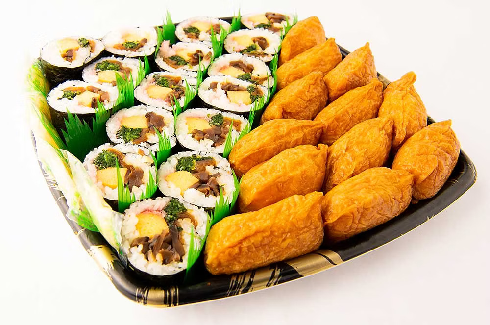 Ingredients: Sushi Rice [White Rice, Water, Sushi Seasoning (High Fructose Corn Syrup, Grain Vinegar, Water, Salt)], Inari [Tofu Pouch (Fried Bean Curd (Water, Soybean, Vegetable Oil (Corn Oil, Canola or Soybean Oil), Magnesium Chloride, Calcium Chloride), High Fructose Corn Syrup, Water, Soy Sauce (Water, Defatted Soybean, Wheat, Salt, Soybean, Alcohol), Caramel (as Coloring), Malic Acid)], Tamago [Egg, Sugar, Soybean Oil, Water, D-Sorbitol, Modified Food Starch, Starch Hydrolysate (Cassava, Sweet Potato), Vinegar, Soy Sauce (Water, Salt, Soybean, Wheat, Rice, Seed Malt), Salt, Soup Base (Corn Syrup, Dried Skipjack Tuna Extract, Dried Skipjack Tuna, Salt, Hydrolyzed Protein (Soybean, Corn, Wheat, Yeast), Dried Scads, Kelp), Sodium Metaphosphate, Monosodium L-Glutamate, Disodium Inosinate, Disodium Guanylate, Beta-Carotene (Color), Sodium Pyrophosphate], Shiitake [Sugar, Water, Dried Shiitake Mushroom, Soy Sauce (Water, Soybeans, Salt, Wheat), Salt, Kelp, Spirit Vinegar (Ethyl Alcohol, Water)], Kanpyo [Water, Dried Gourd Shavings, Sugar, Soy Sauce (Water, Soybeans, Salt, Wheat), Caramel Color, Salt, Sweet Cooking Rice Wine (Water, Glutinous Rice)], Spinach, Roasted Seaweed (Seaweed).