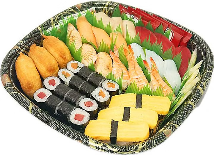 Ingredients: Sushi Rice [White Rice, Water, Sushi Seasoning (High Fructose Corn Syrup, Grain Vinegar, Water, Salt)], California Roll [Crab Filling (Imitation Crab Meat (Wild Alaska Pollock, Water, Potato Starch, Sugar, Egg Whites, Contains 2% or Less of Snow Crab Meat, Mirin Wine, Salt, Artificial Crab Flavor, and Color)), Mayonnaise (Soybean Oil, Egg Yolk, Distilled Vinegar, High Fructose Corn Syrup, Contains Less Than 2% of Water, Salt, Mustard Seed, Calcium Disodium EDTA (to Protect Flavor), Paprika Oleoresin (Color)), Avocado, Cucumber, Roasted Seaweed (Seaweed)], Nigiri [Tuna (Yellow Fin Tuna, Carbon Monoxide (Color)), Salmon, Yellow Tail, Shrimp (Shrimp, Salt), Tamago (Egg, Sugar, Soybean Oil, Water, D-Sorbitol, Modified Food Starch, Starch Hydrolysate (Cassava, Sweet Potato), Vinegar, Soy Sauce (Water, Salt, Soybean, Wheat, Rice, Seed Malt), Salt, Soup Base (Corn Syrup, Dried Skipjack Tuna Extract, Dried Skipjack Tuna, Salt, Hydrolyzed Protein (Soybean, Corn, Wheat, Yeast), Dried Scads, Kelp), Sodium Metaphosphate, Monosodium L-Glutamate, Disodium Inosinate, Disodium Guanylate, Beta-Carotene (Color), Sodium Pyrophosphate))].